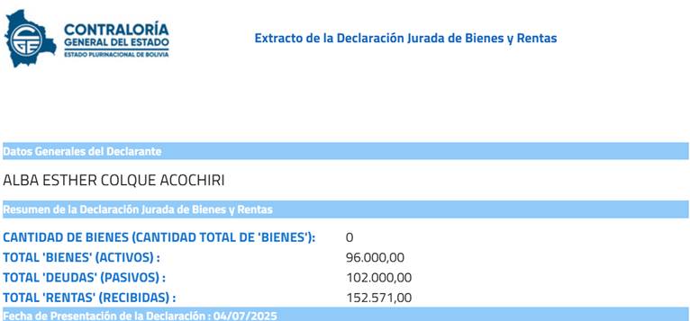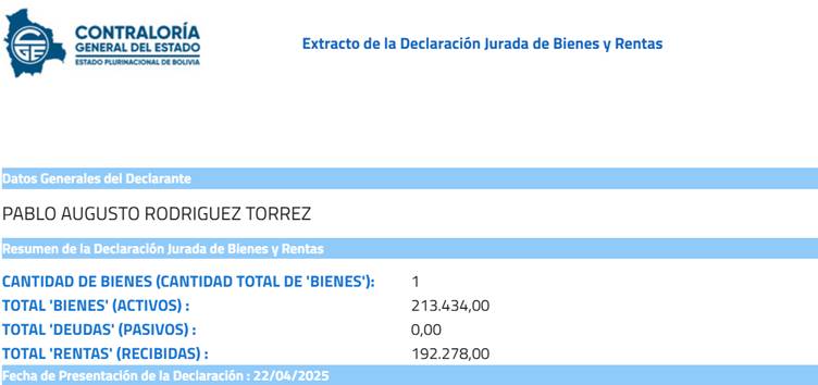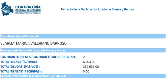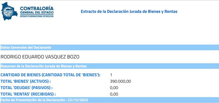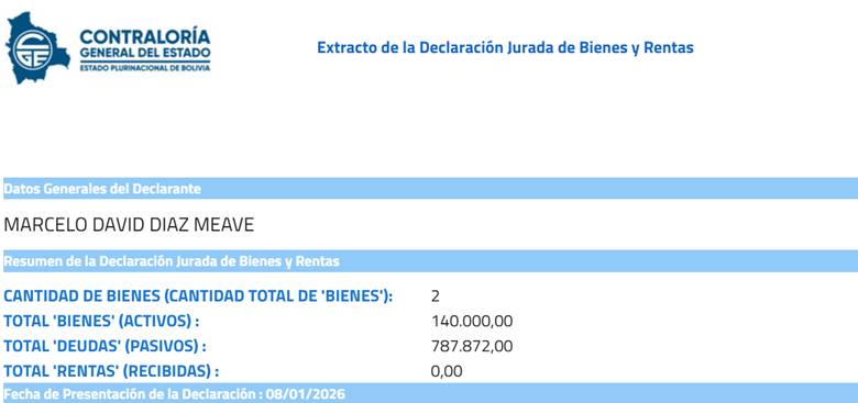 Su más reciente declaración jurada data del 8 de enero de 2026; es decir, en la presente gestión de Rodrigo Paz.