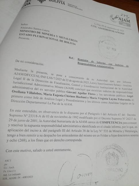 La Paz, 23 febrero (ANA).- A más de cuatro meses de la asunción del Gobierno de Rodrigo Paz (PDC), la Autoridad Jurisdiccional Administrativa Minera (AJAM), dependiente del Ministerio de Minería y Metalurgia, conserva a una parte del MAS en su estructura de poder. Quienes formaron parte del personal de las gestiones de Evo Morales y Luis Arce, permanecen en cargos decisivos, tanto a nivel nacional como departamental.