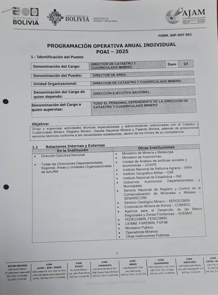 Conforme al documento Programación Operativa Anual Individual (POAI – 2025) que define el perfil y las funciones del Director de Catastro y Cuadriculado Minero no deja margen a interpretaciones, ya que el cargo como director de catastro está dirigido a un perfil de especialista en ciencias geoespaciales.