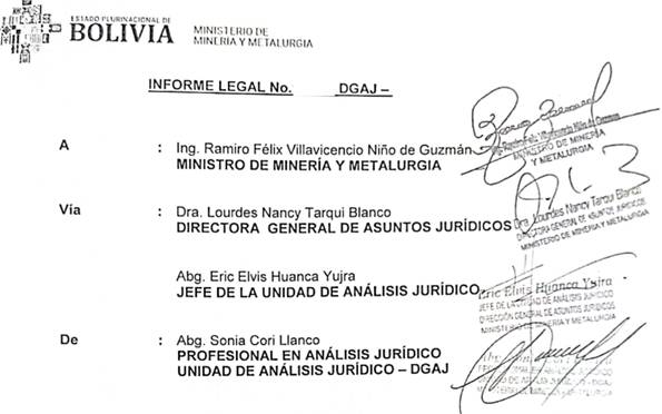 Dichos antecedentes señalan que Cori Llanco brindó asesoría jurídica en procesos vinculados a la emisión de Certificados de Trámite y Cumplimiento Administrativo Minero (CETCAM) a favor de cooperativas mineras que no se adecuaron a la Ley 535 de minería y metalurgia, actuaciones que, según las observaciones contenidas en esos mismos documentos, habrían sido cuestionadas por presuntas inconsistencias en el marco establecido en la Ley Minera.